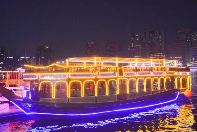 Experience an unforgettable evening with the Glass Cruise In Dubai Marina. Enjoy a peaceful evening cruise on a glass boat in Dubai Marina, with stunning views, a tasty dinner, and live entertainment shows. As you glide over the clear waters, marvel at the stunning architecture of the city’s resorts and residences. The glittering city lights create a magical atmosphere, enhanced by a welcoming drink upon your arrival.